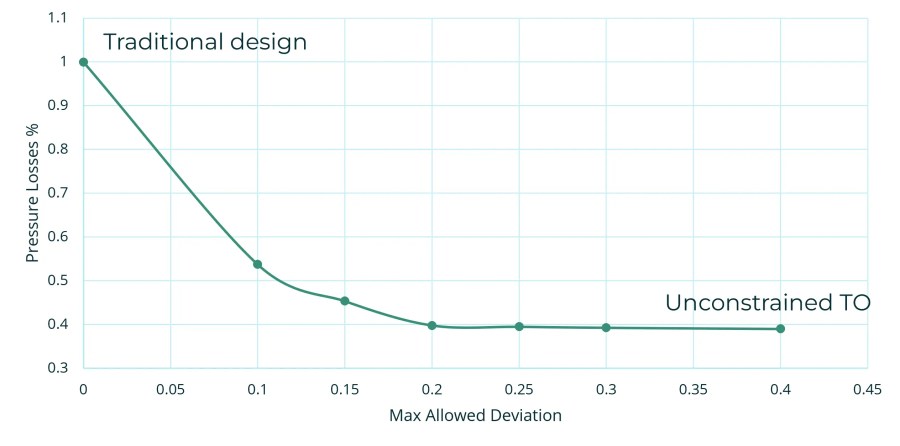 From the plot below, we see how a mere 10% variation from the original design already provides most of the benefit in terms of pressure losses. In other words, you can stay very close to a design you already know how to certify and manufacture, while still gaining a significant performance boost.